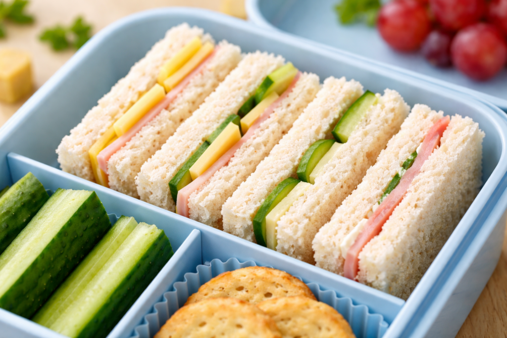 Mini-Waffeln, Muffins, Käsewürfel, Apfelspalten, Gemüsesticks und schlichte Sandwich- oder Wrap-Varianten.