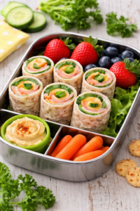 Wrap mit Frischkäse oder Hummus bestreichen, aufrollen und in kleine Stücke schneiden.