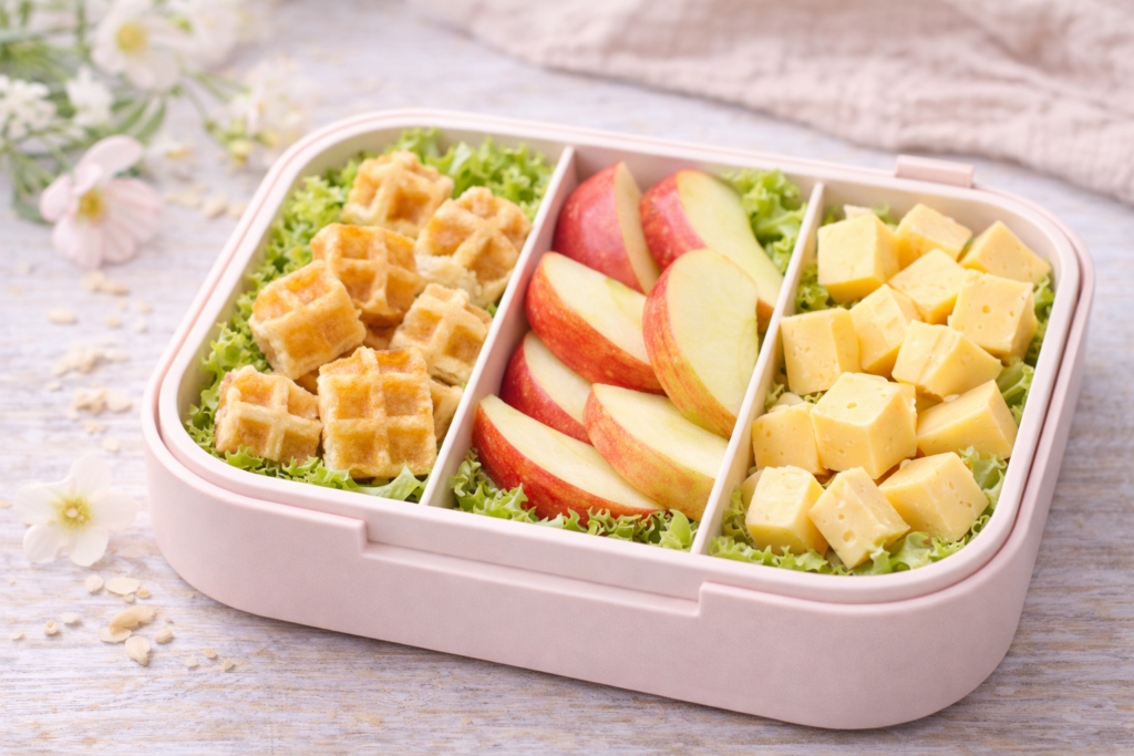 Diese Kombination ist perfekt für Kinder, die snackige Brotdosen lieber essen als klassische Pausenbrote. Die Waffelstücke wirken vertraut und unkompliziert, Apfelspalten bringen Frische hinein und Käsewürfel sorgen für etwas Sättigendes.